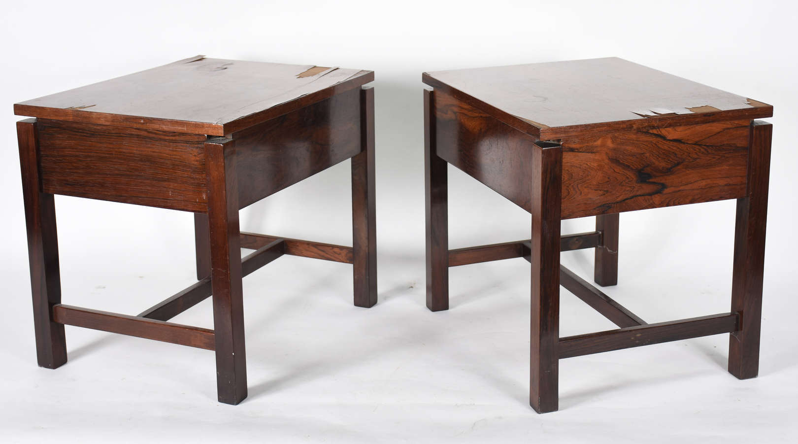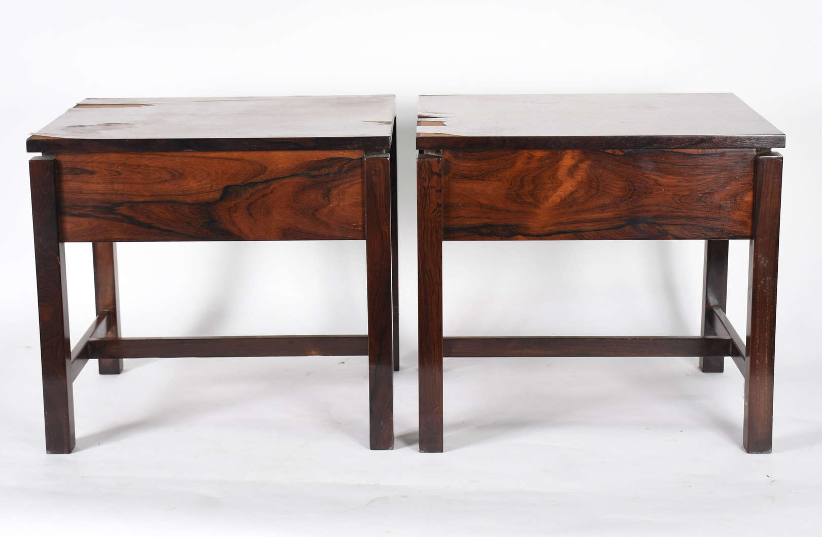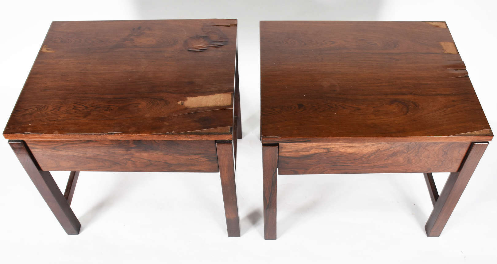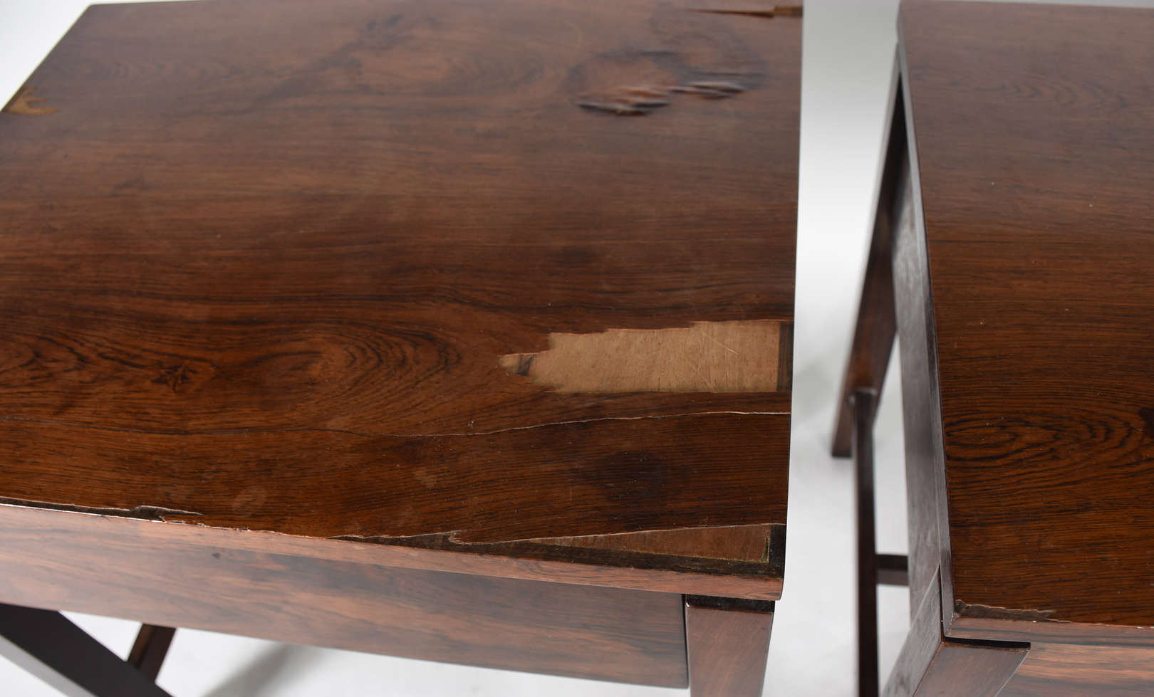 Par de mesinhas laterais de compensado folheado com uma gaveta cada. (partes faltando folheado)