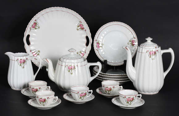 Pequeno serviço para café de porcelana Real, composto de 2 bules, leiteira, 5 xícaras com pires, 5 pratinhos de sobre...