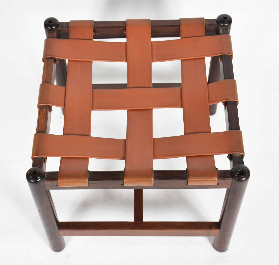 Mesa quadrada de jacarandá com tampo de vidro e pernas cilíndricas. Década de 60.