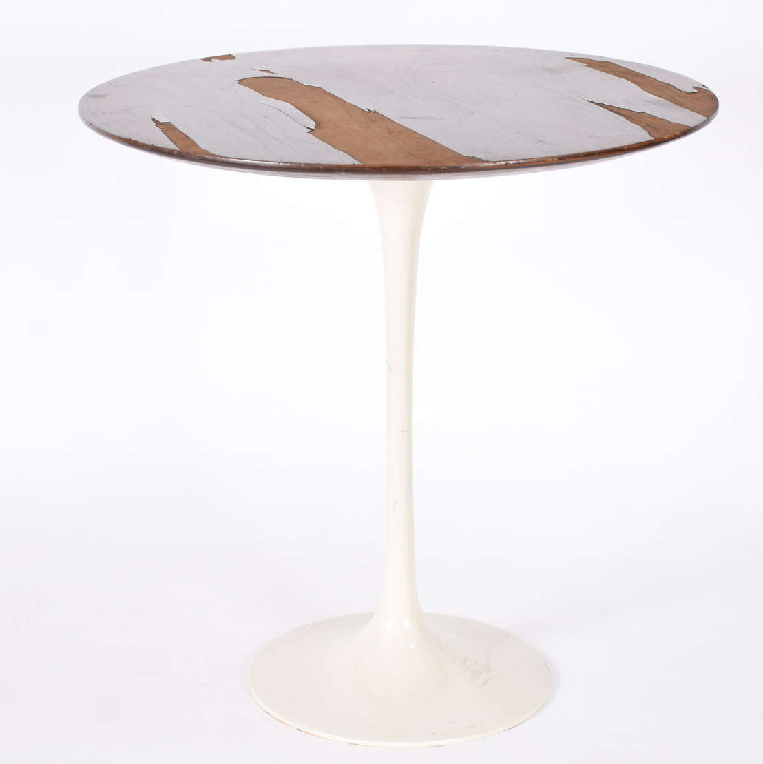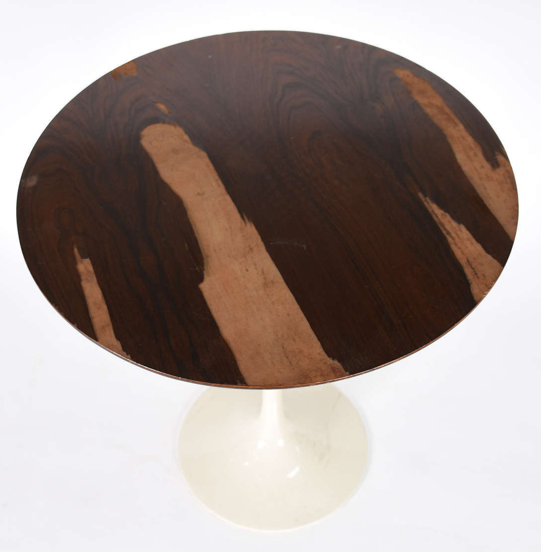 Mesinha redonda com pé de metal pintado de branco e tampo de madeira folheada (faltando parte do folheado). Anos 60.