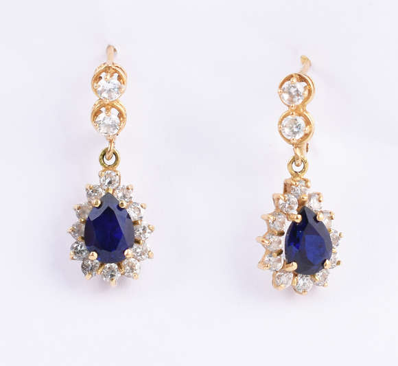 Par de brincos tipo gota, com 2 safiras azuis, variadas safiras brancas. (por questão de segurança a peça não se enco...