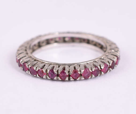 Aliança completa de ouro branco com 27 rubis, aro 14. (por questão de segurança a peça não se encontra na loja).