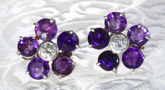 Par de brincos com ametistas e 2 brilhantes de aprox. 0,40 pontos total. Cor " GH " Pureza " VS " . Formato de flor e...