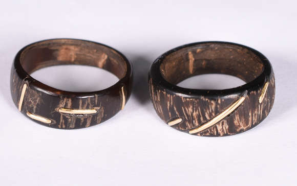 Dois anéis ditos de escravas, de côco com aplicação de ouro, séc XIX aro 24,e aro 19.