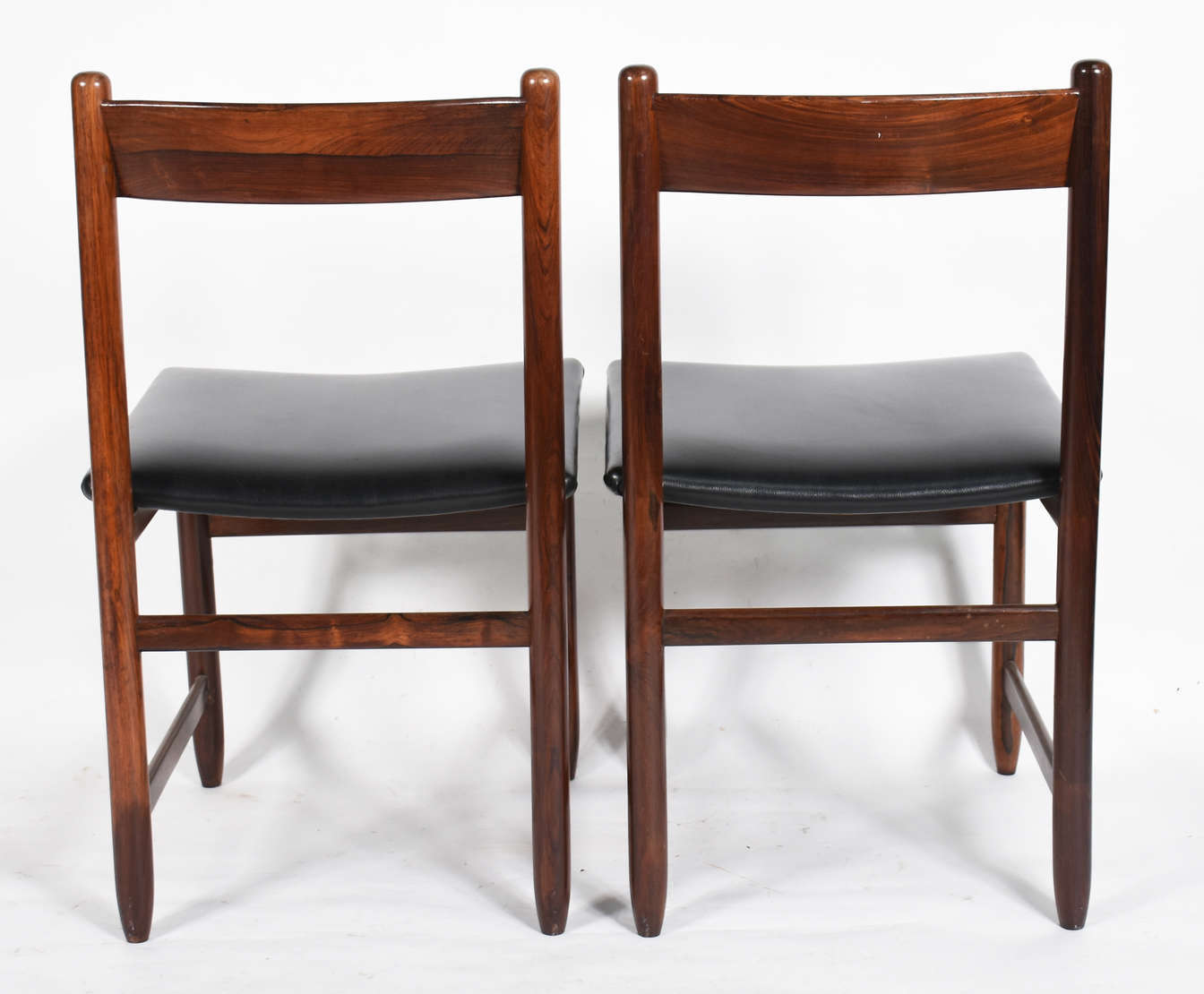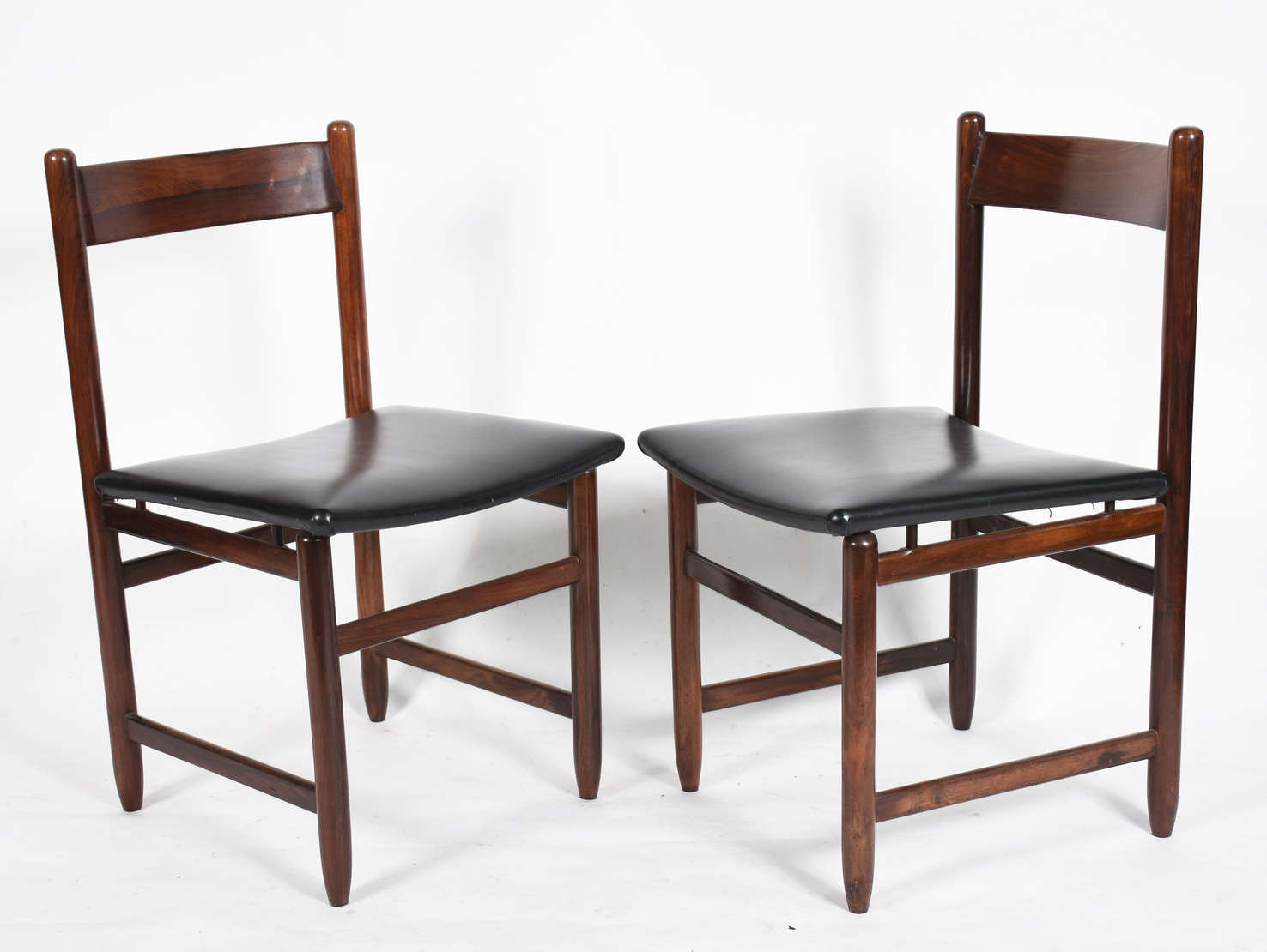 Quatro cadeiras de madeira nobre com assentos e encostos estofados e forrados na cor creme.