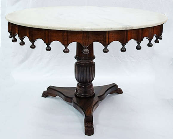 Mesa de apresentação feitio redondo, de jacarandá, saia com bilros torneados, apoio em coluna central em gomos apoia...