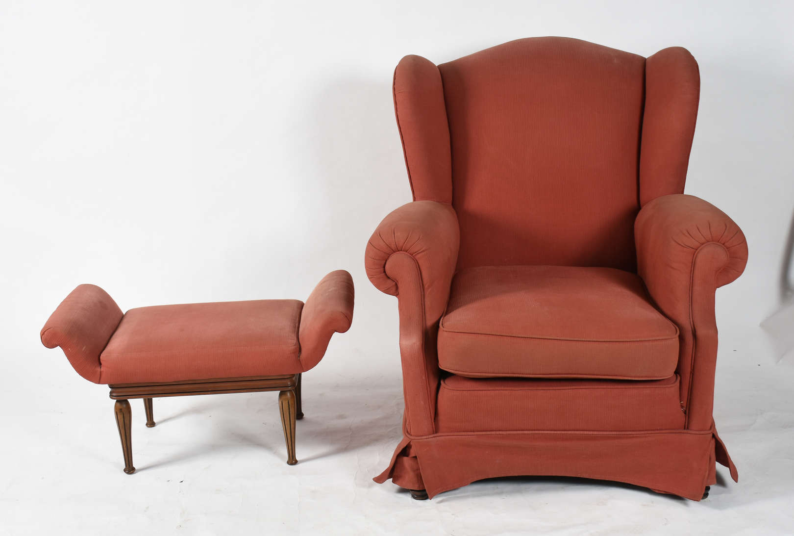 Banqueta de madeira nobre com pés palito e assento estofado e forrado com tecido mostarda e tacheados. (com desgastes).