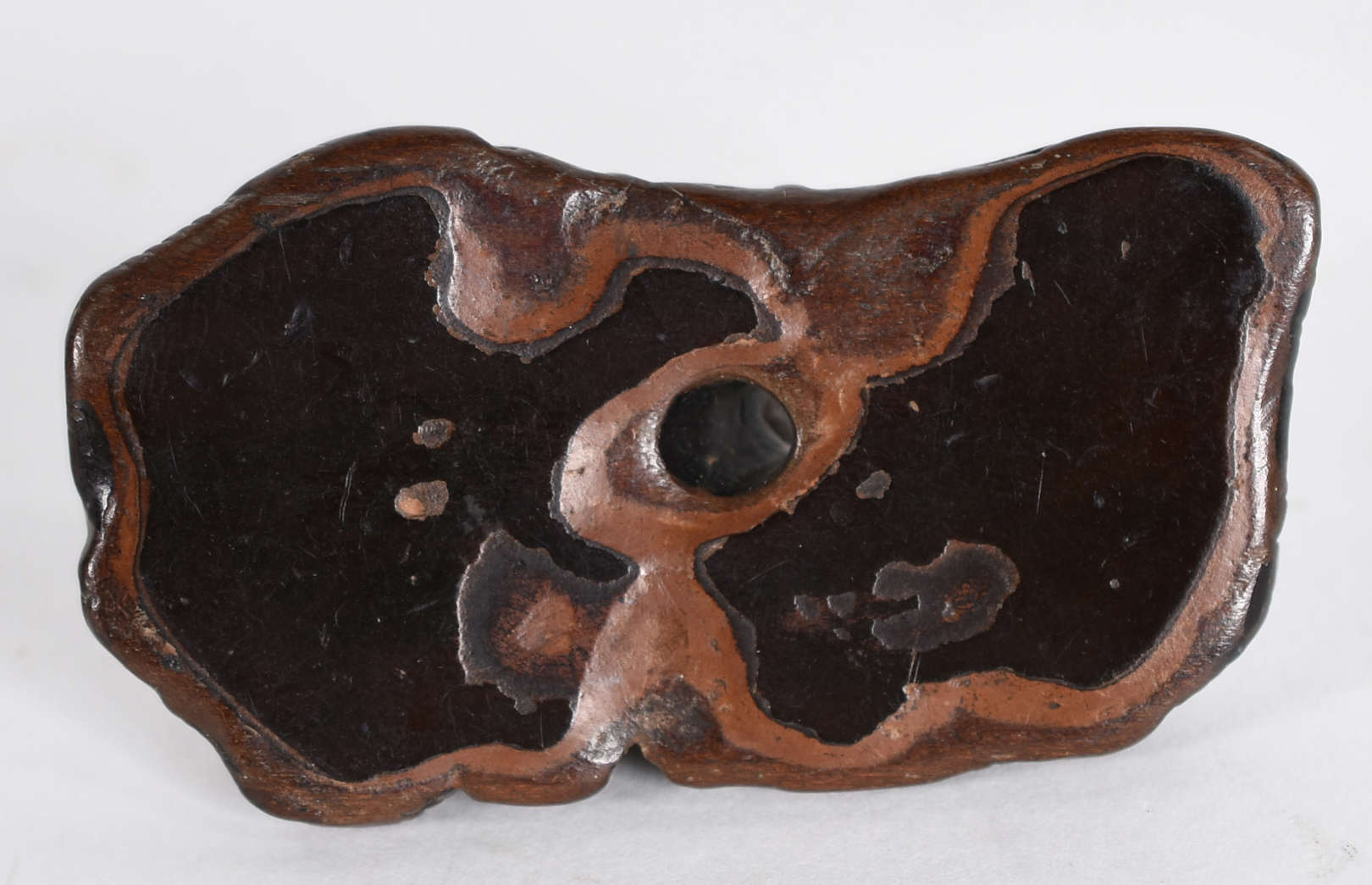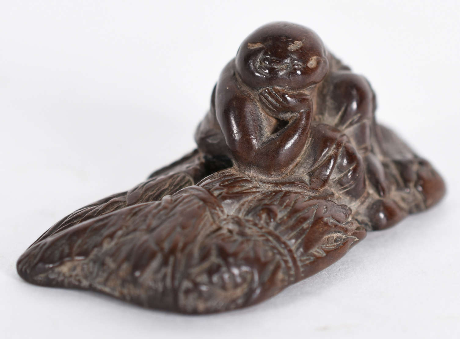 Raro Netsuke em madeira de ébano, do tipo sashi "alongado", representando ASHINAGA E TENAGA com olhos encrustados em ...