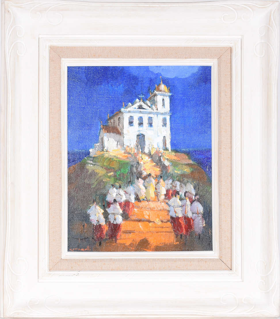 Antiga ícone decorativo italiano sobre madeira com moldura entalhada representando o nascimento de Jesus.