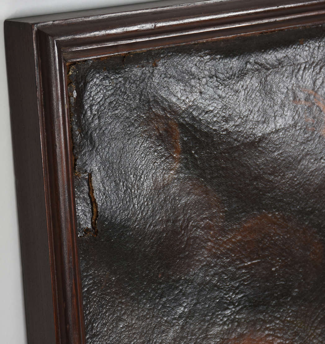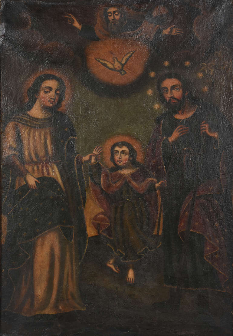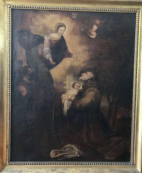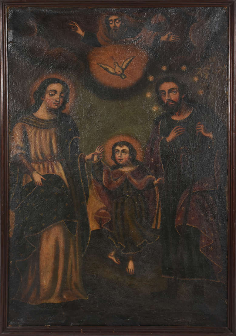 Antiga ícone decorativo italiano sobre madeira com moldura entalhada representando o nascimento de Jesus.