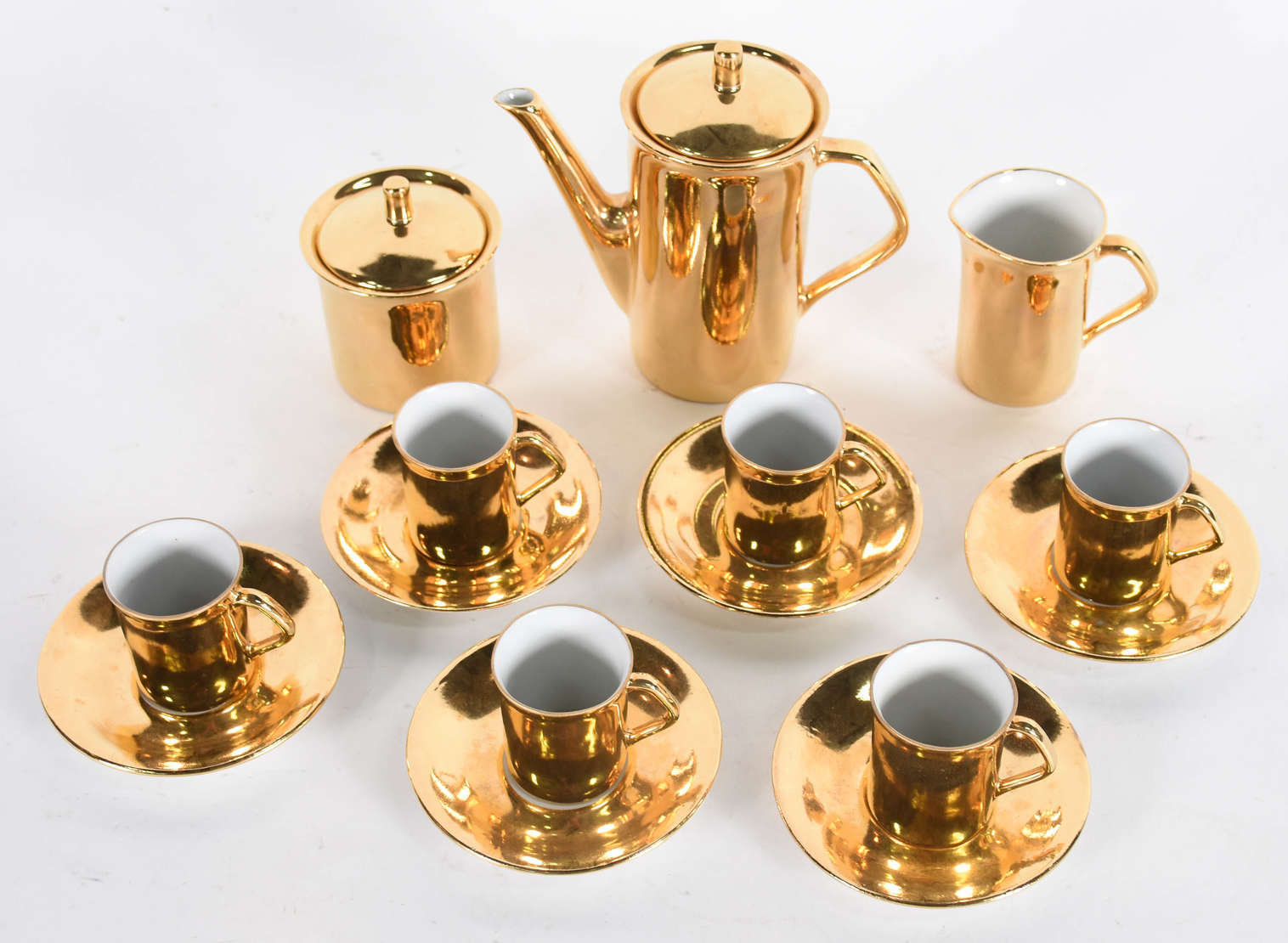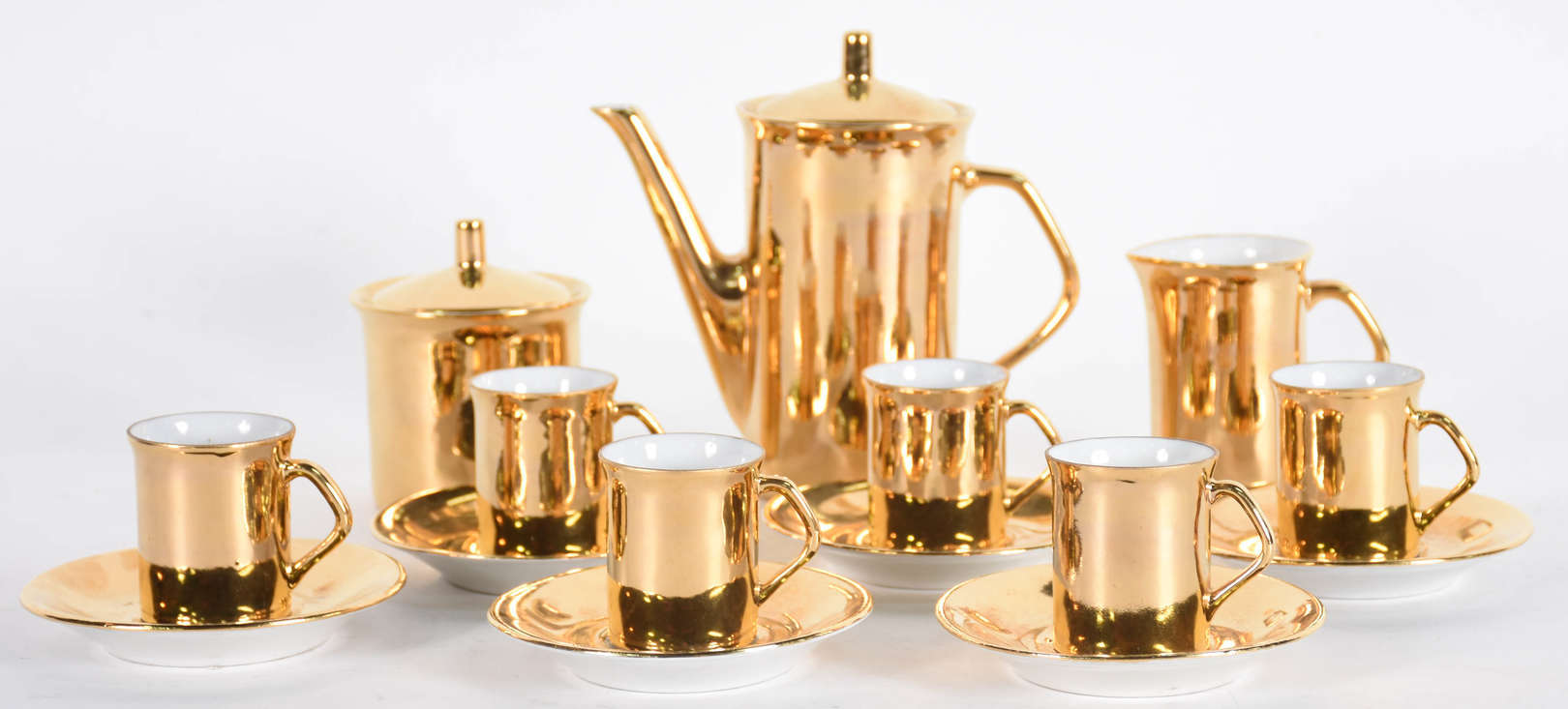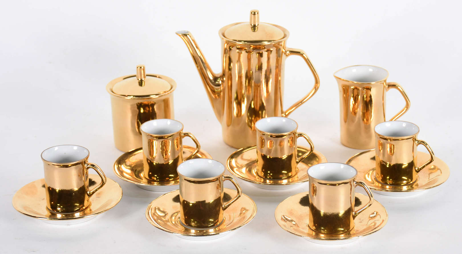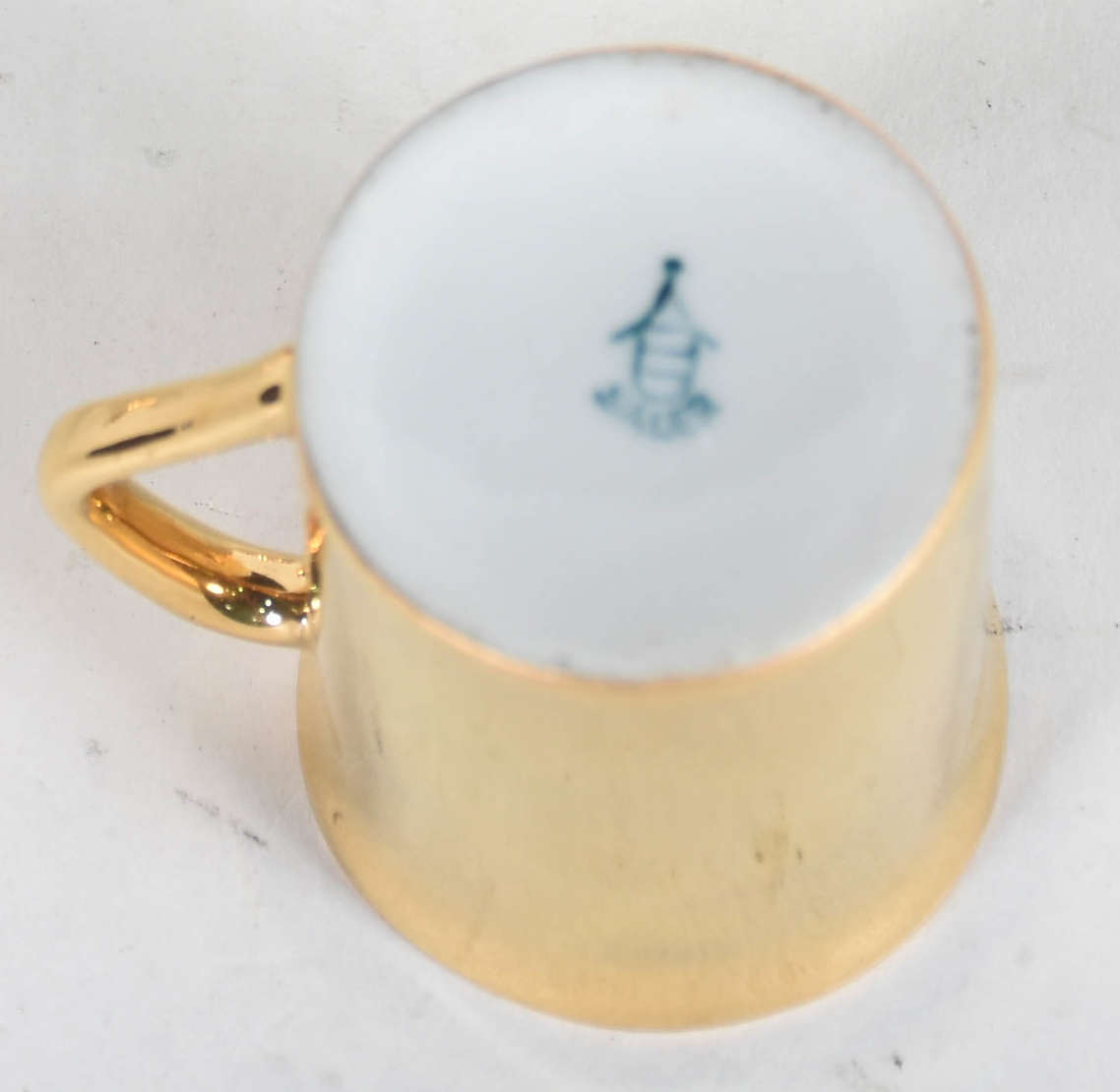 Conjunto com 10 xícaras para café de de porcelana com bases e pires de metal prateado.