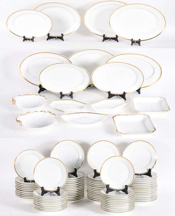 Elegante aparelho de jantar de porcelana francesa VIEUX PARIS na cor branca com frisos dourados, composto de 58 prato...
