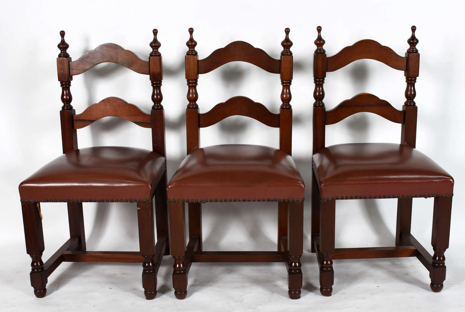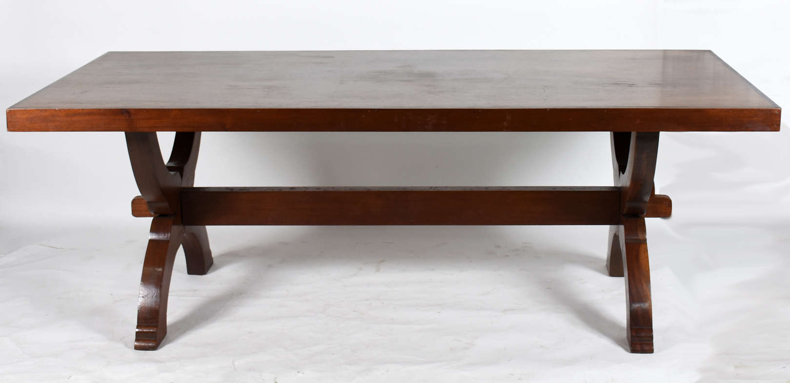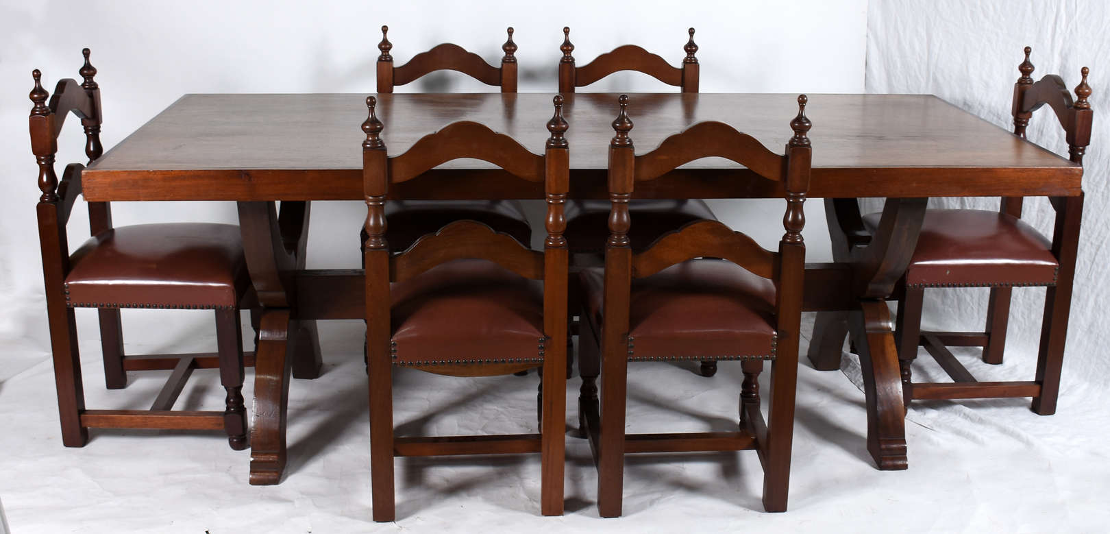 Mesa de jantar de madeira nobre, estilo colonial brasileiro, tampo retangular apoiado em duas bases feitio "X" ligadas por trave central. Acompanham 6 cadeiras com assentos estofados e encostos com pinos torneados.
