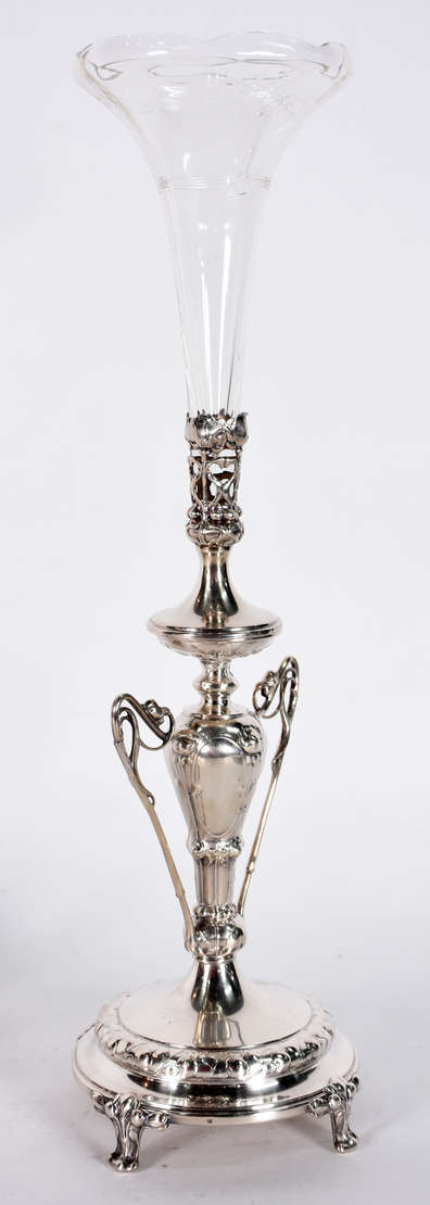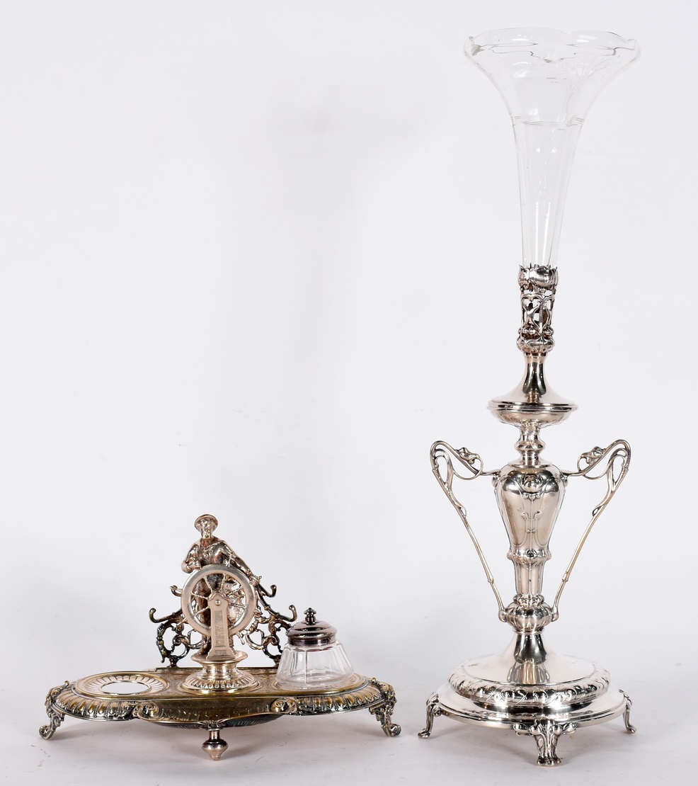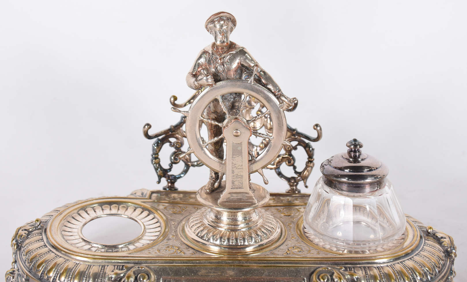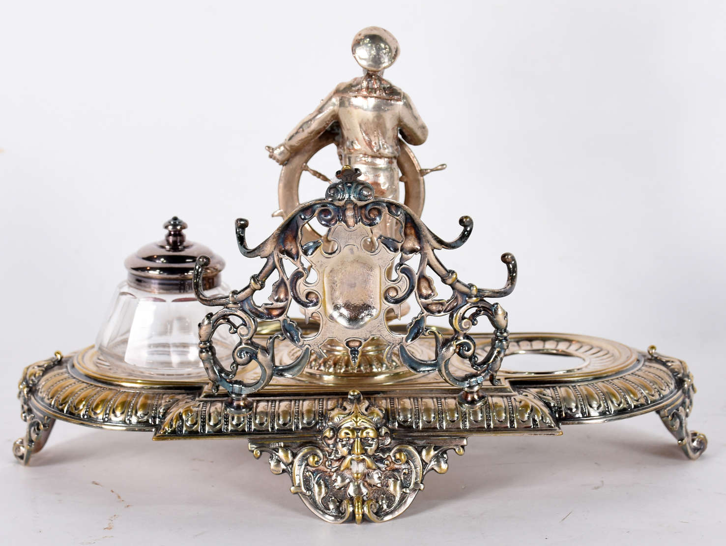 Centro de mesa de porcelana francesa azul cobalto e dourado, parte central com figura de ninfa e anjo.
