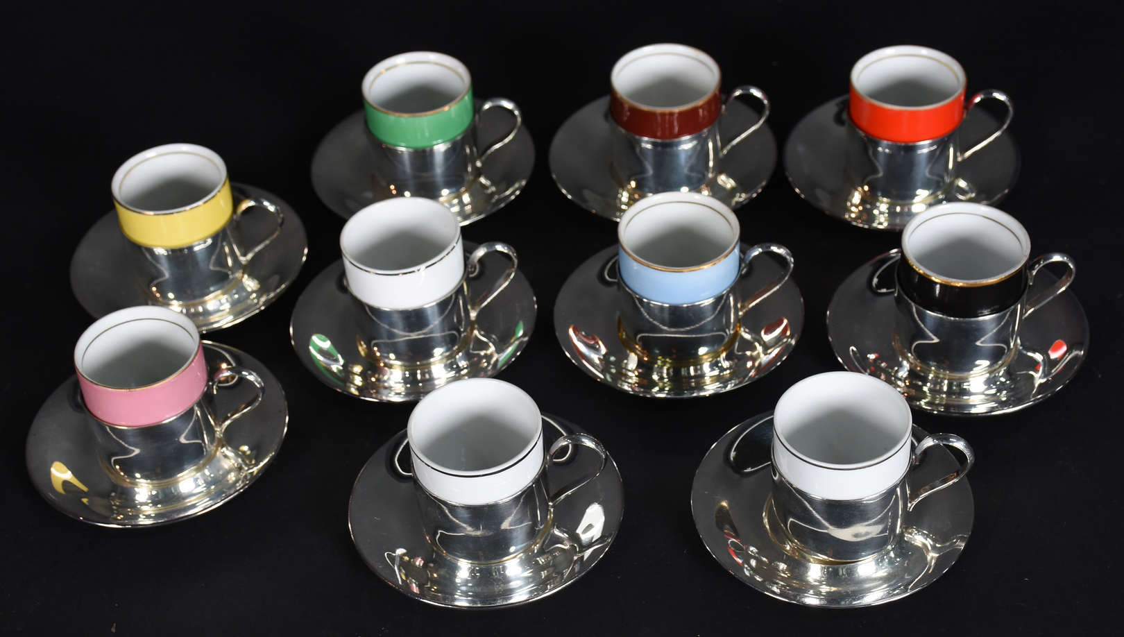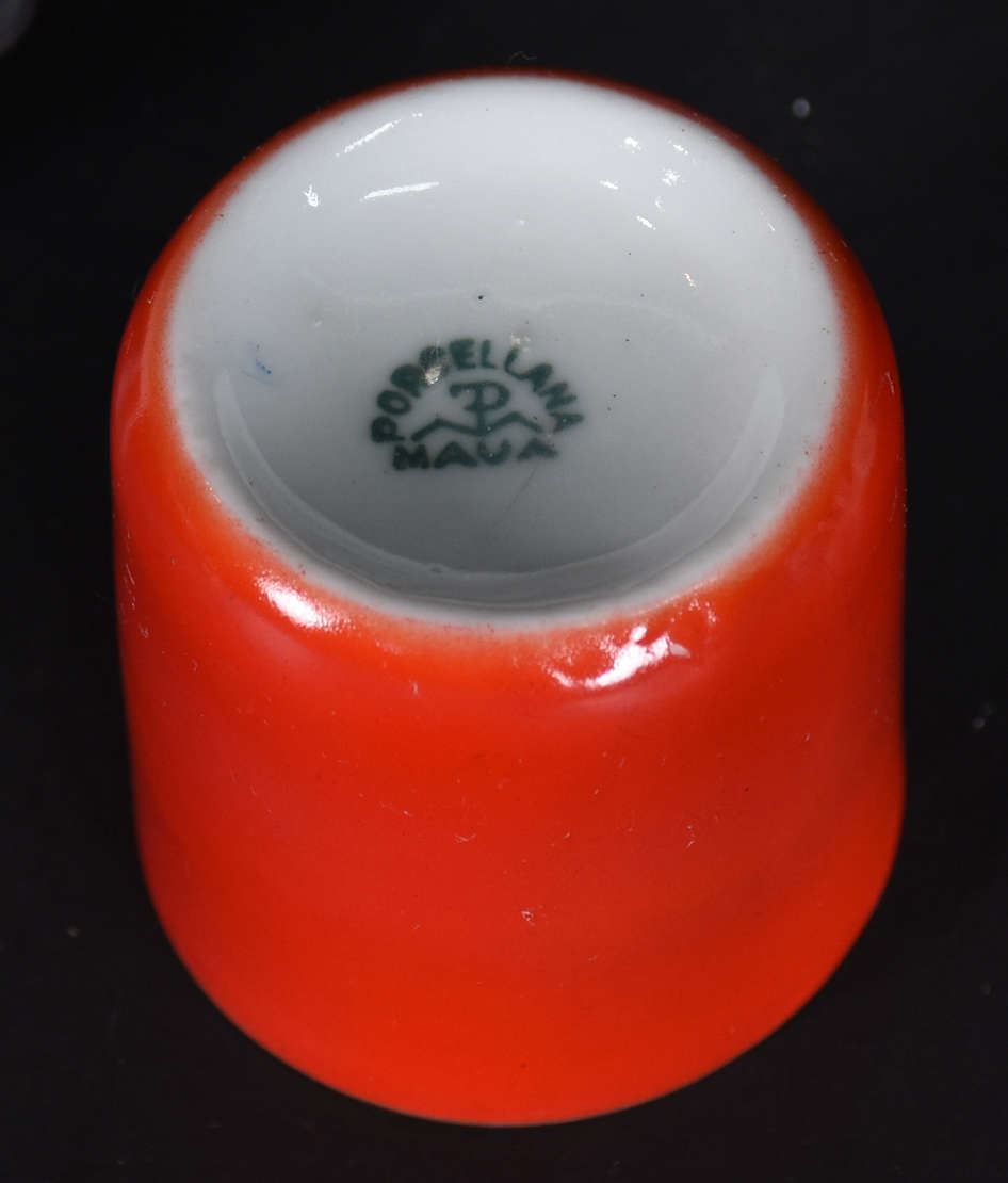 Pequeno serviço de café de porcelana dourada composto de 6 xícaras com pires, bule, leiteira e açucareiro.