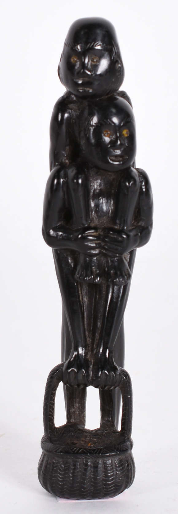 Raro Netsuke em madeira de ébano, do tipo sashi "alongado", representando ASHINAGA E TENAGA com olhos encrustados em ...