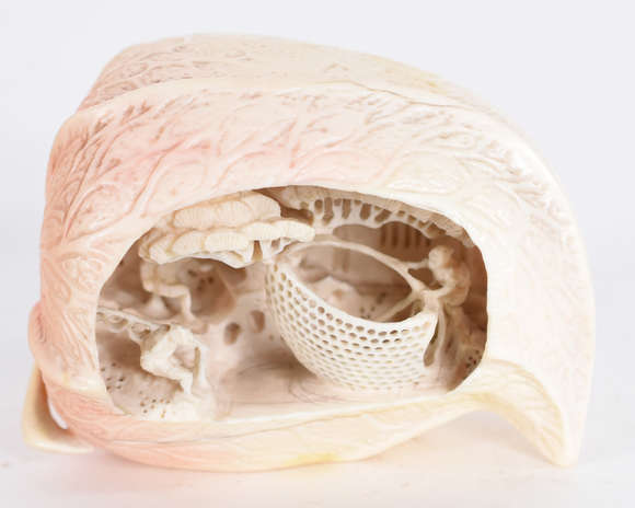 Escultura japonesa em marfim no formato de péssego apresentando cena de pesca em seu interior. Época Meiji (1868 a 19...