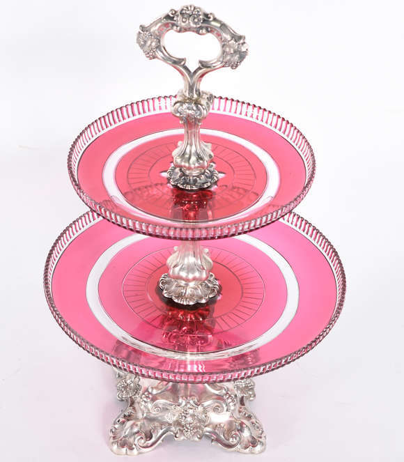 Elegante fruteira de prata contrastada com 2 pratos de cristal rosa lapidados nas bordas. Peso só da prata 350 g.