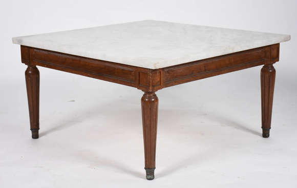 Mesa lateral de madeira nobre, pernas cilíndricas frisadas, tampo de mármore branco.