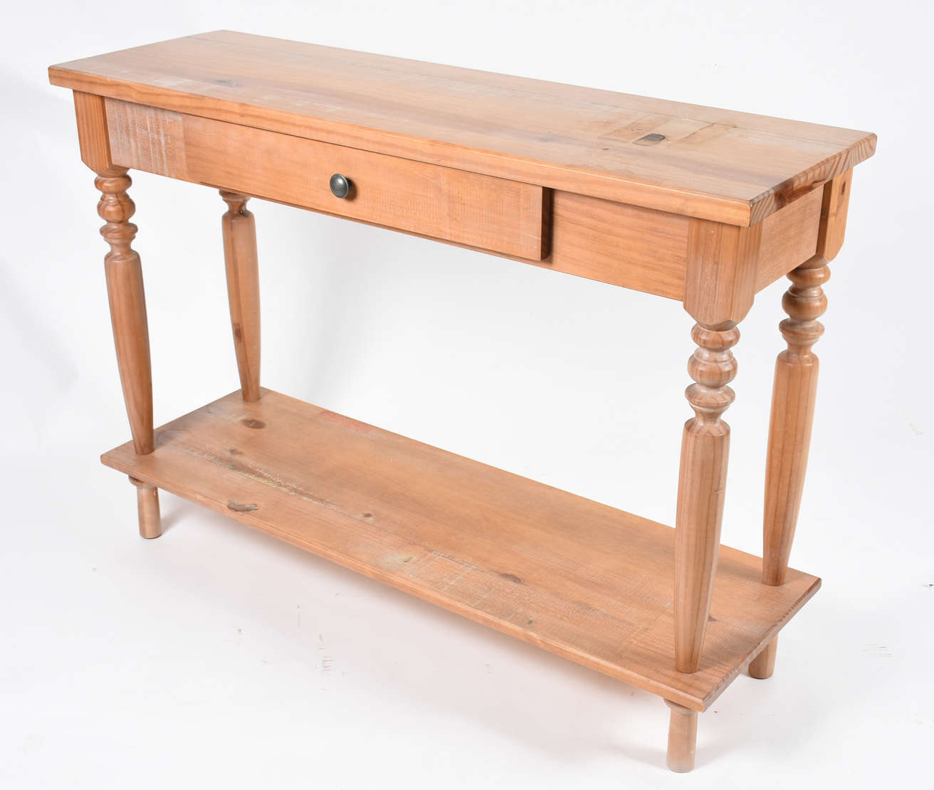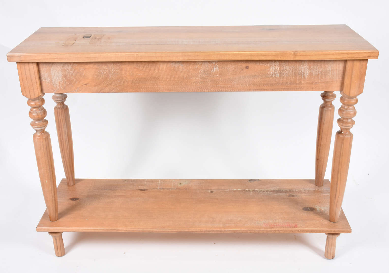 Mesa feitio retangular de madeira clara com quatro pernas torneadas.