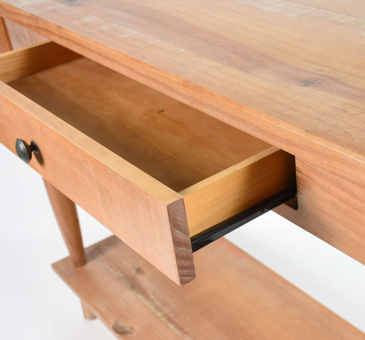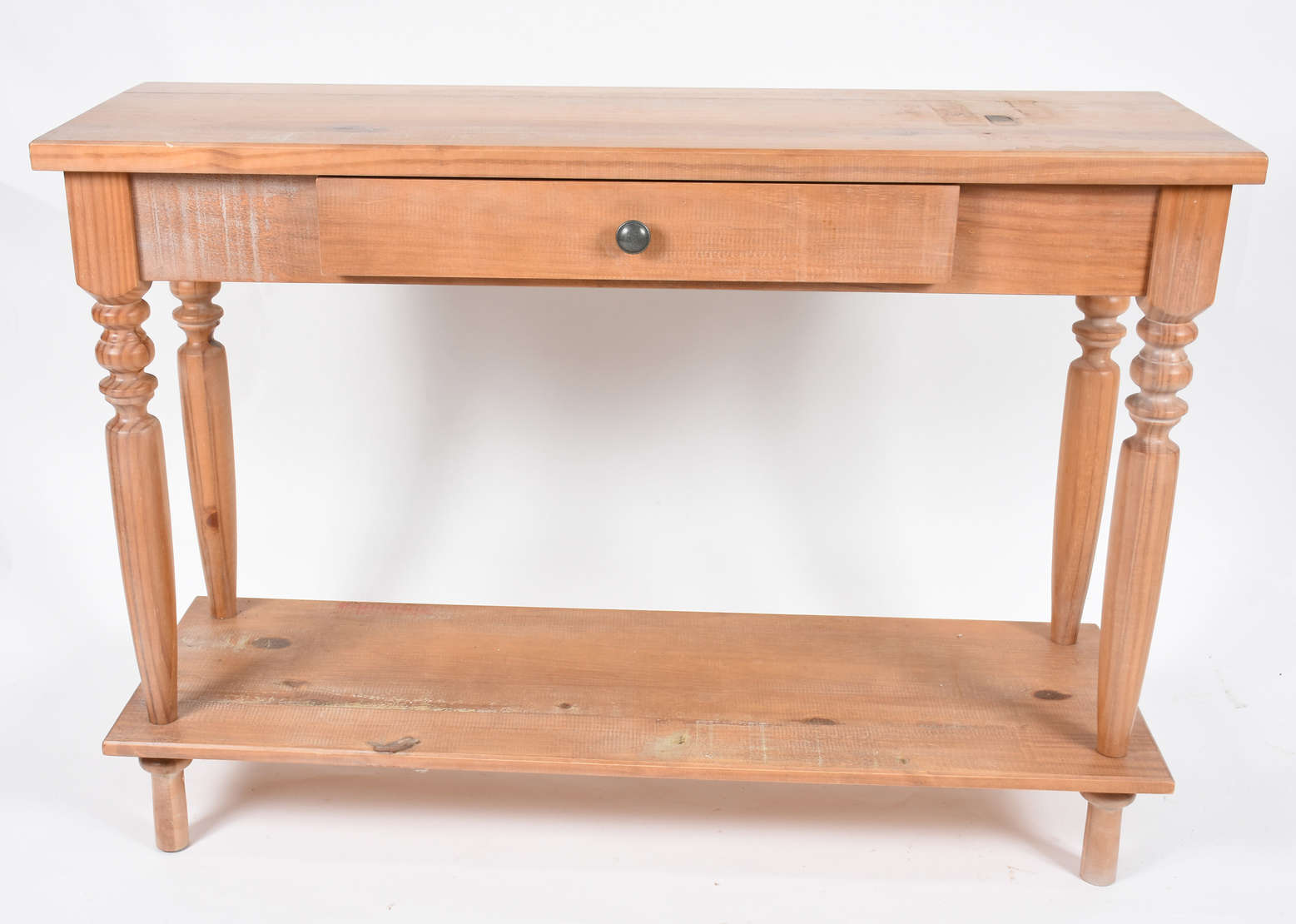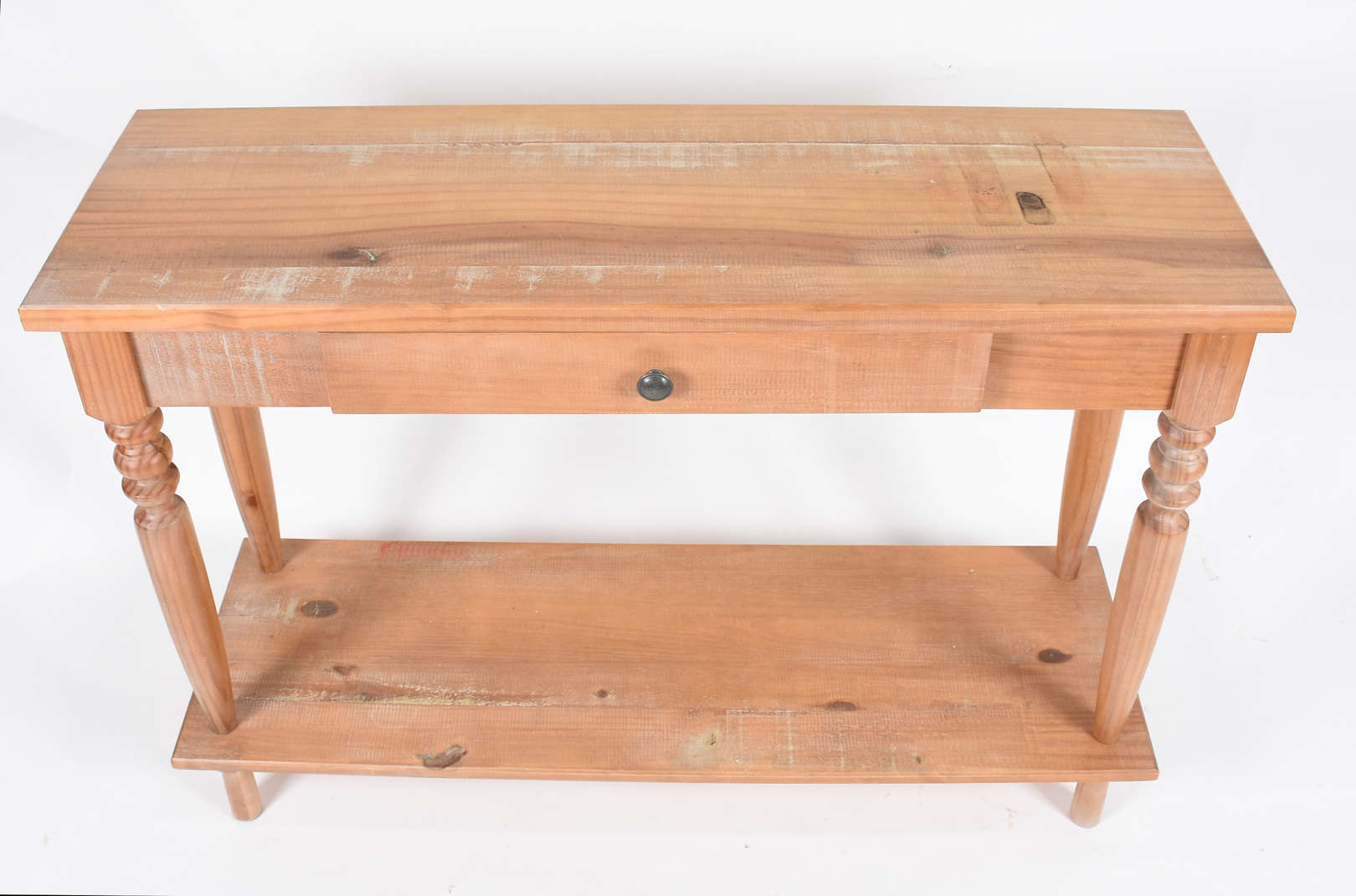 Aparador de madeira com platô inferior em ripas. (pequenos furos no tampo, talvez "broca")