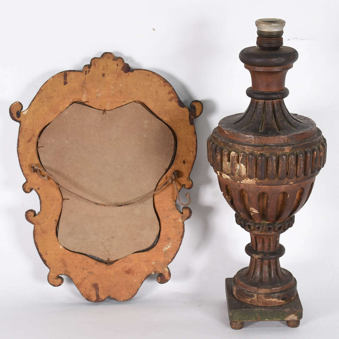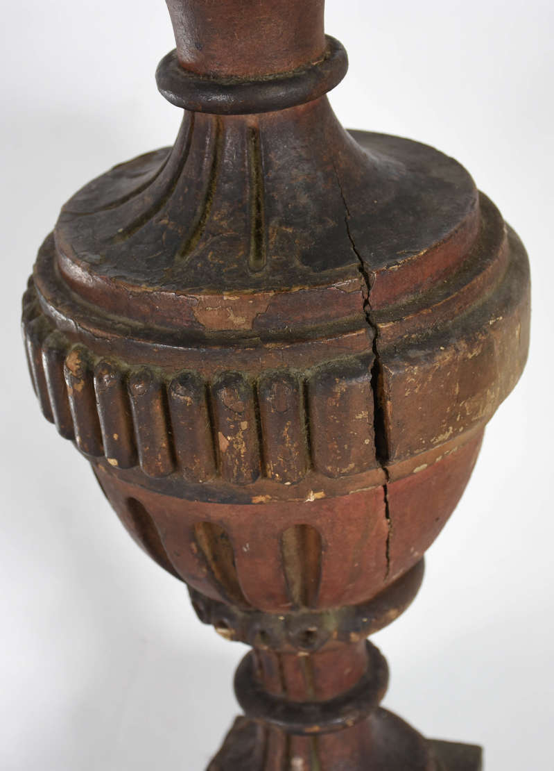 Par de abatjoures de louça branca no formato de potiches, bases de madeira, acompanham as cúpulas.