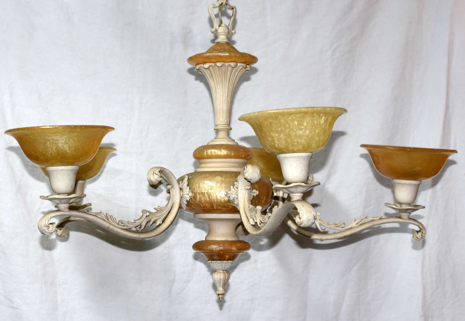 Lustre de metal pintado de bege e resina com 5 braços.