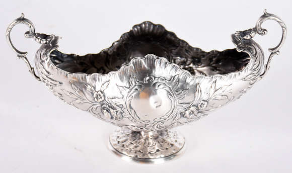 Pequena floreira feitio navete de prata portuguesa contraste Javali, flores e folhas em relevo. (pequeno amassado).