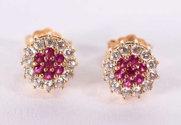 Par de brincos de ouro amarelo 18 k com safiras brancas e rubis. (Por motivo de segurança as peças não se encontram n...