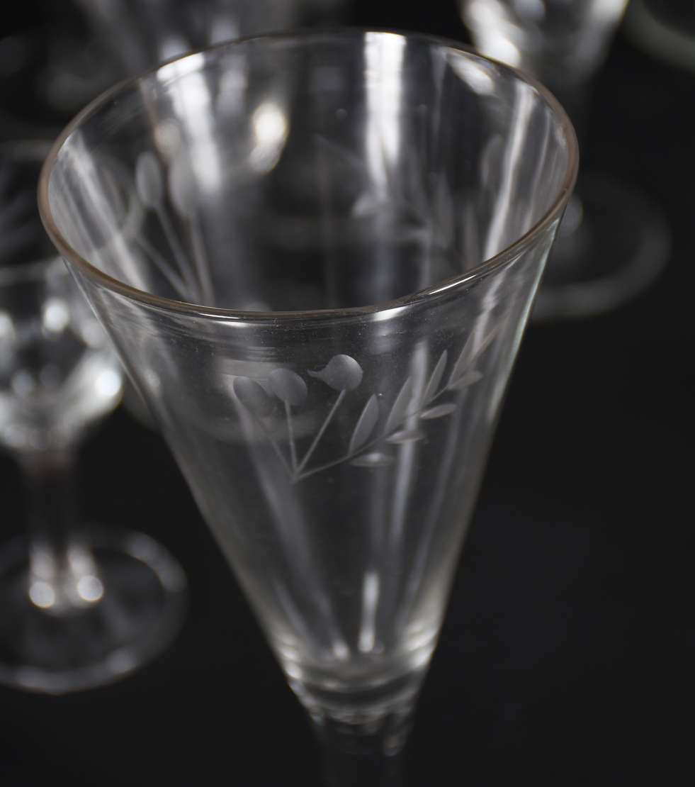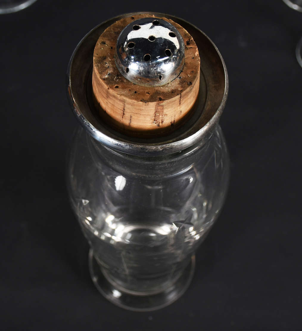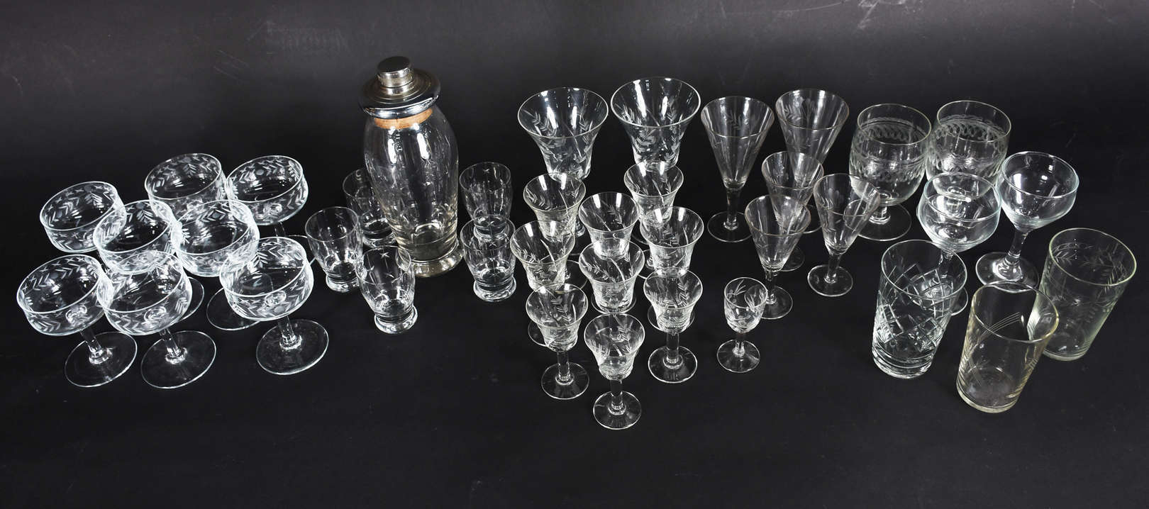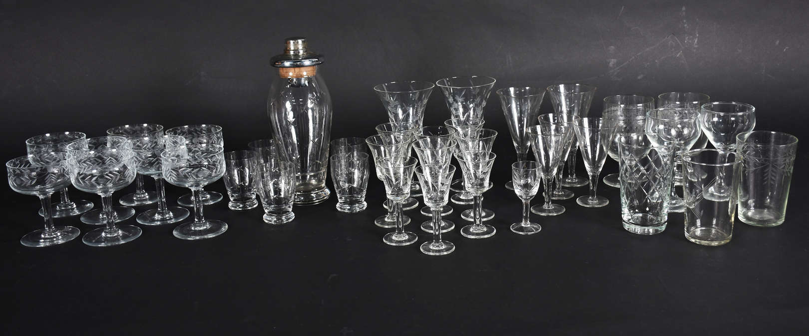 Diversas peças de vidro sendo, 8 taças para champagne, coqueteleira com 5 copinhos e 24 copos diversos. Total 38 peças.