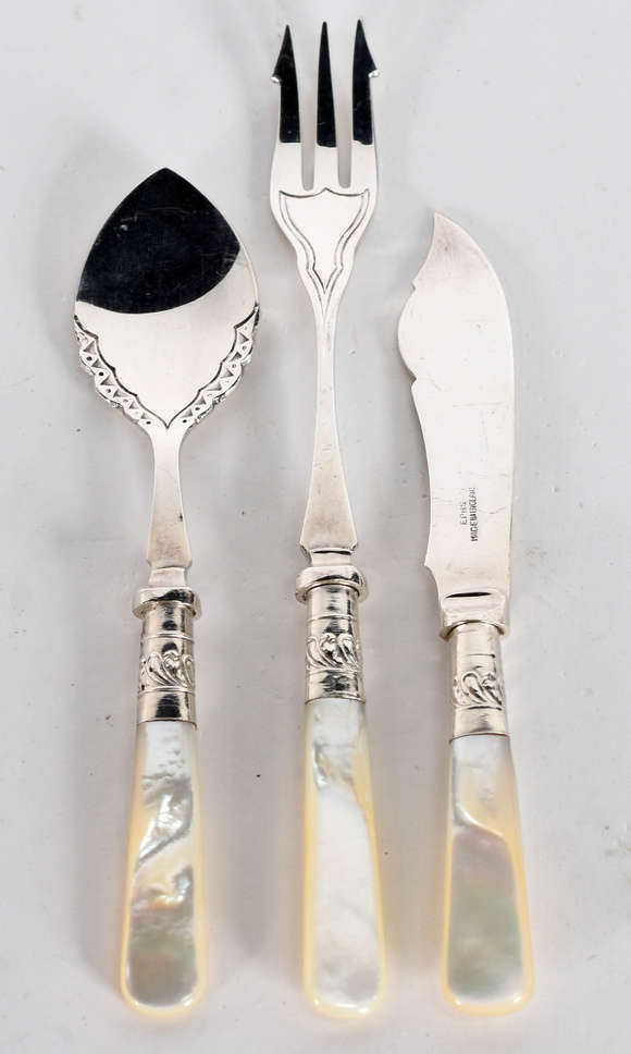TIFFANYS - tres pequenos talheres de metal EPNS com cabos de madrepérola.