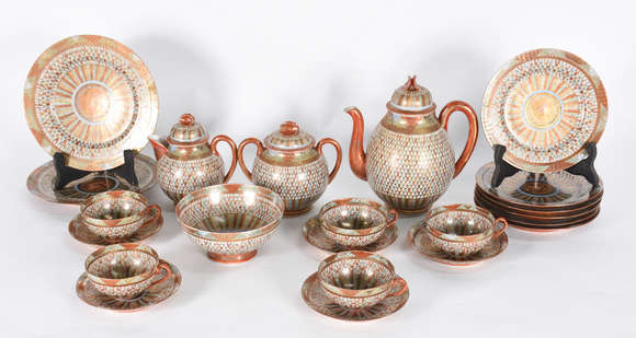 Conjunto para café de porcelana oriental, composto de 5 xícaras com pires, 5 pratos de sobremesa, 2 bules, açucareiro...