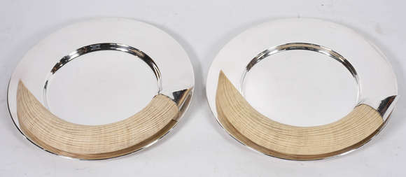 Par de travessas redondas de metal prateado com detalhes em "chifre" na borda, marca "Due Sorelle".