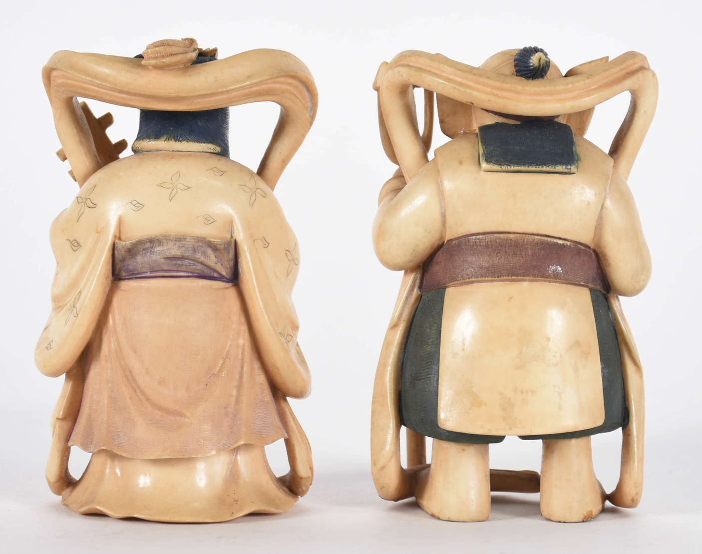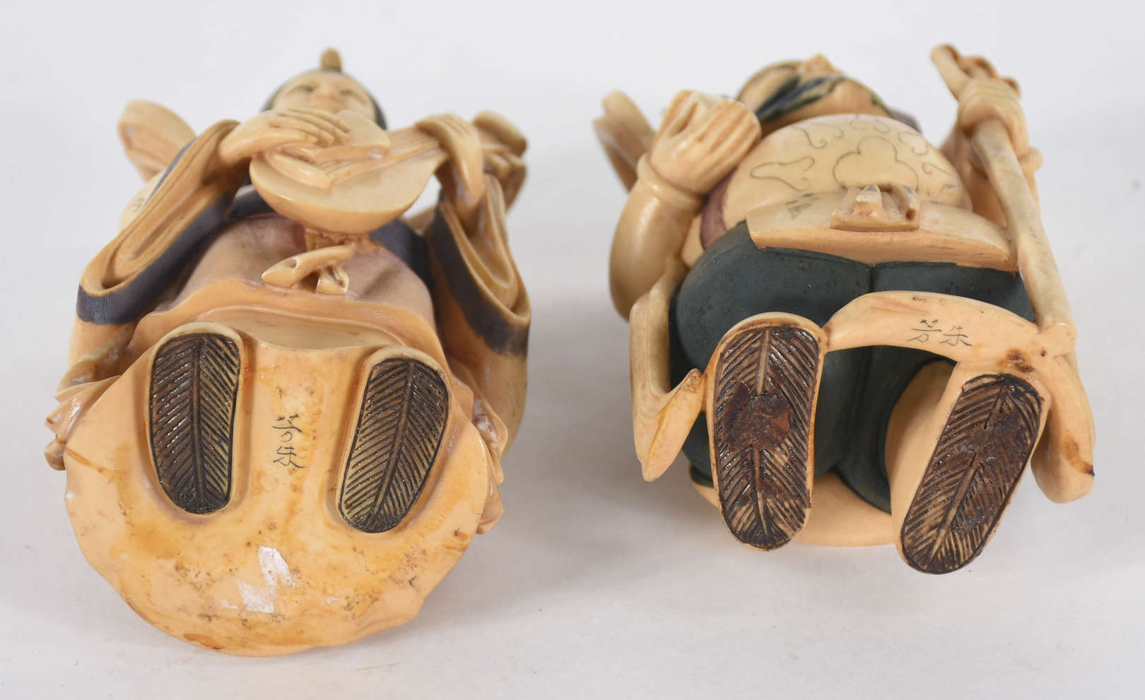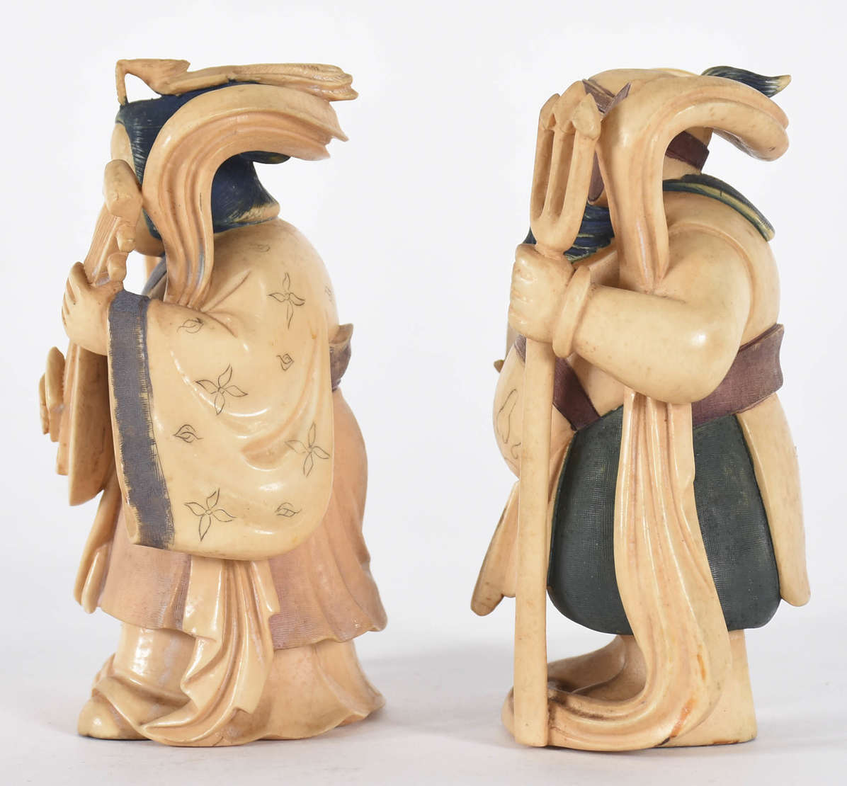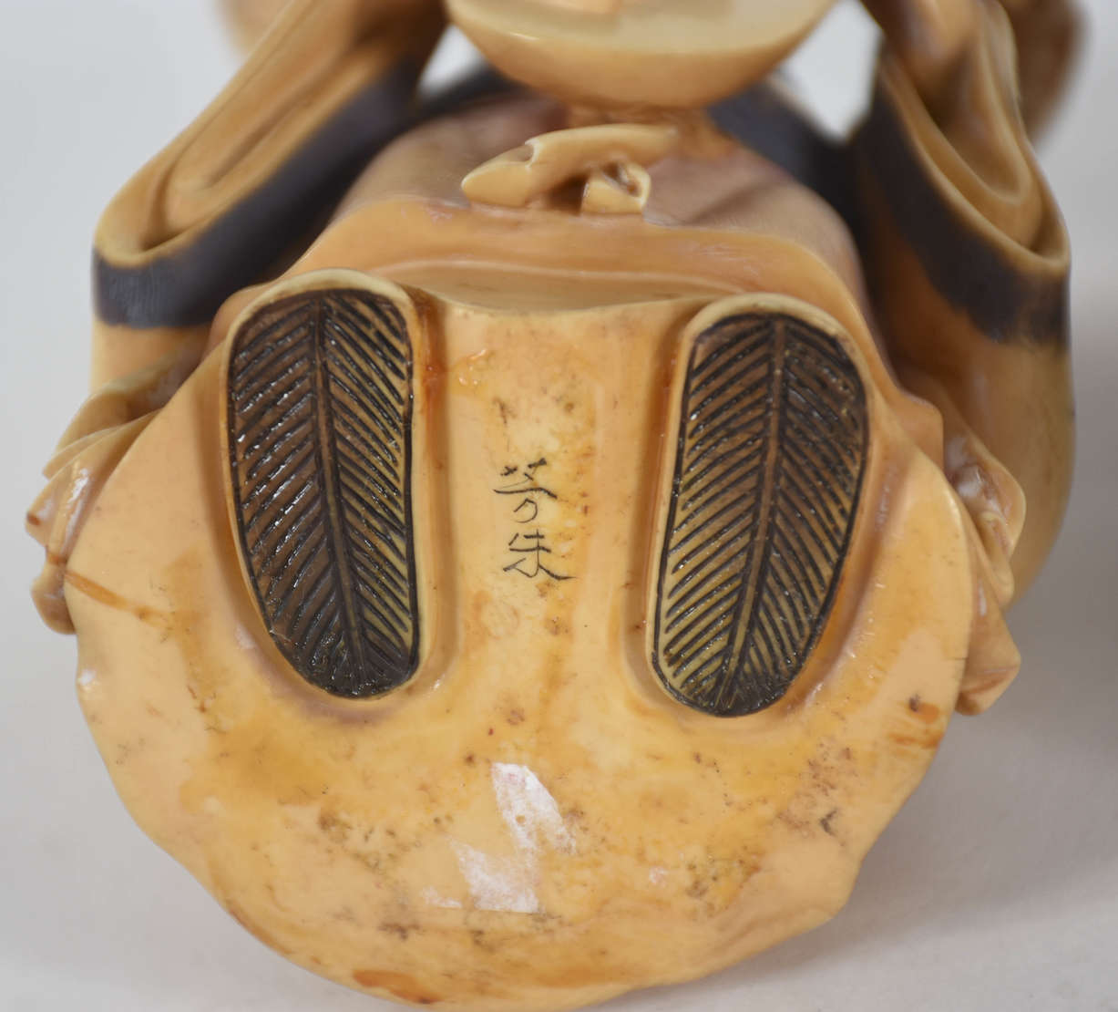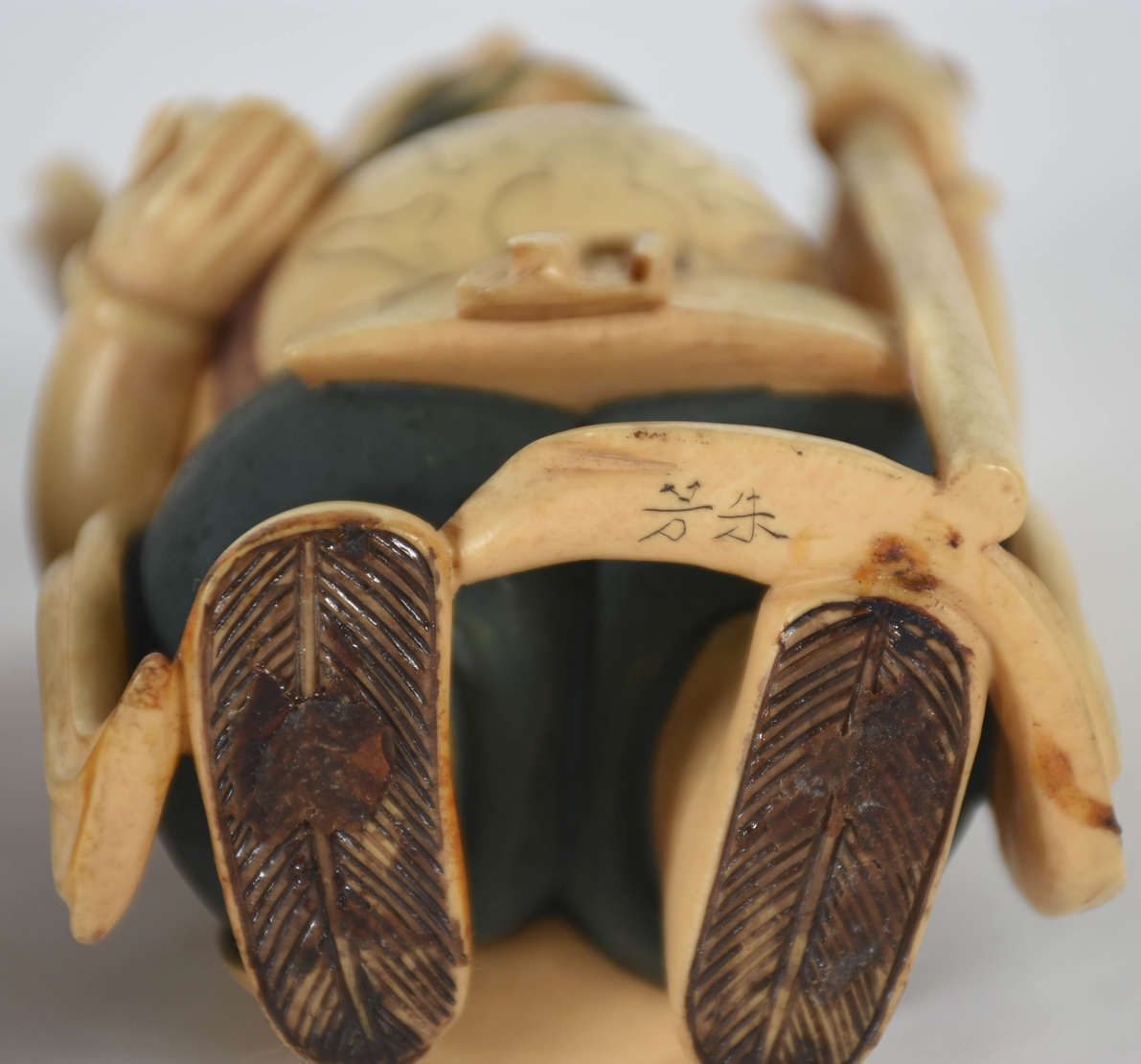 Estatueta de marfim representando homem com dragão. Século XIX, Base com assinatura e flor.