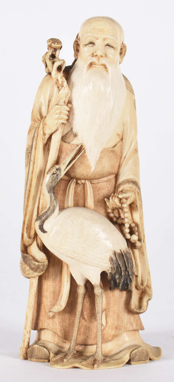 Estatueta de marfim representando homem com garça, século XIX, base com selo vermelho.