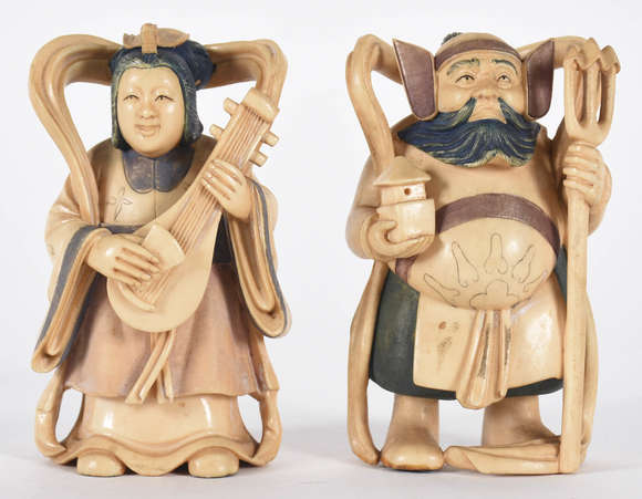 Par de estatuetas de marfim representando casal, ela tocando banjo e ele com tridente. Assinados na base.