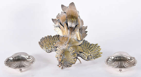 Tres peças diversas, sendo galo de metal e 2 conchas.