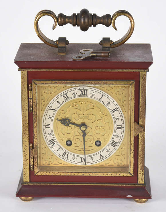 Relógio de mesa da marca "LUXOR", caixa de madeira na cor vinho e metal dourado, pega na parte superior.