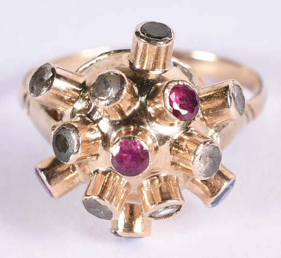 Anel de ouro 18 k, tipo mina com pedras coloridas (Por segurança, a peça não esta na loja).