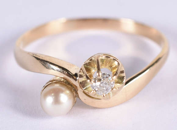 Anel no feitio Romeu e Julieta com brilhantes de aproximadamente 0,10 ct e pérola, aro 21 (por motivos de segurança a...