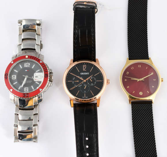 Três relógios de pulso, sendo um da marca Tommy Hilfigher, um Orient e um Chillibeans.