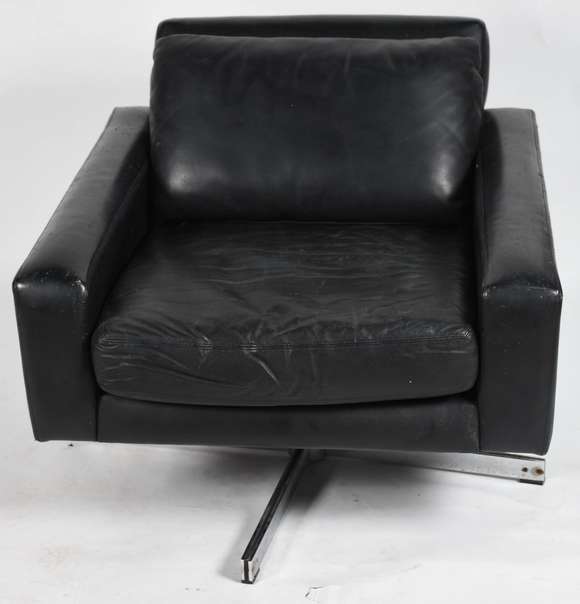 Poltrona de couro preto, base de metal giratoria, (com desgastes).Esta Poltrona faz parte da coleção lounge, produzid...
