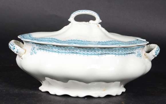 Sopeira de faiança inglesa na cor branca decorada com guirlanda floral azul.