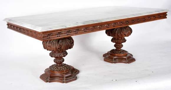Mesa de centro de madeira nobre trabalhada com tampo de mármore.