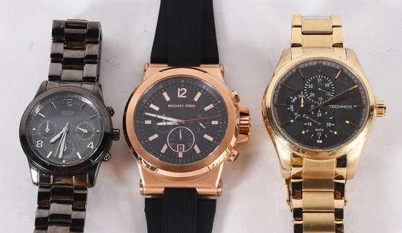 Três relógios de pulso, sendo: Um da marca Guess, um Michael Kors, e um Technos.