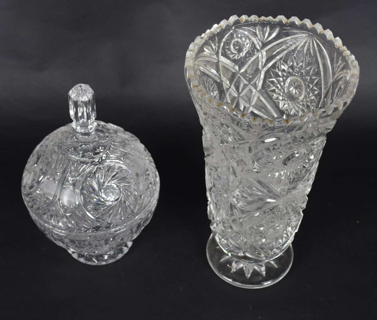 Duas peças sendo, garrafa em bloco de cristal feitio quadrado (tampa com pequeno defeito na parte interna) e porta co...