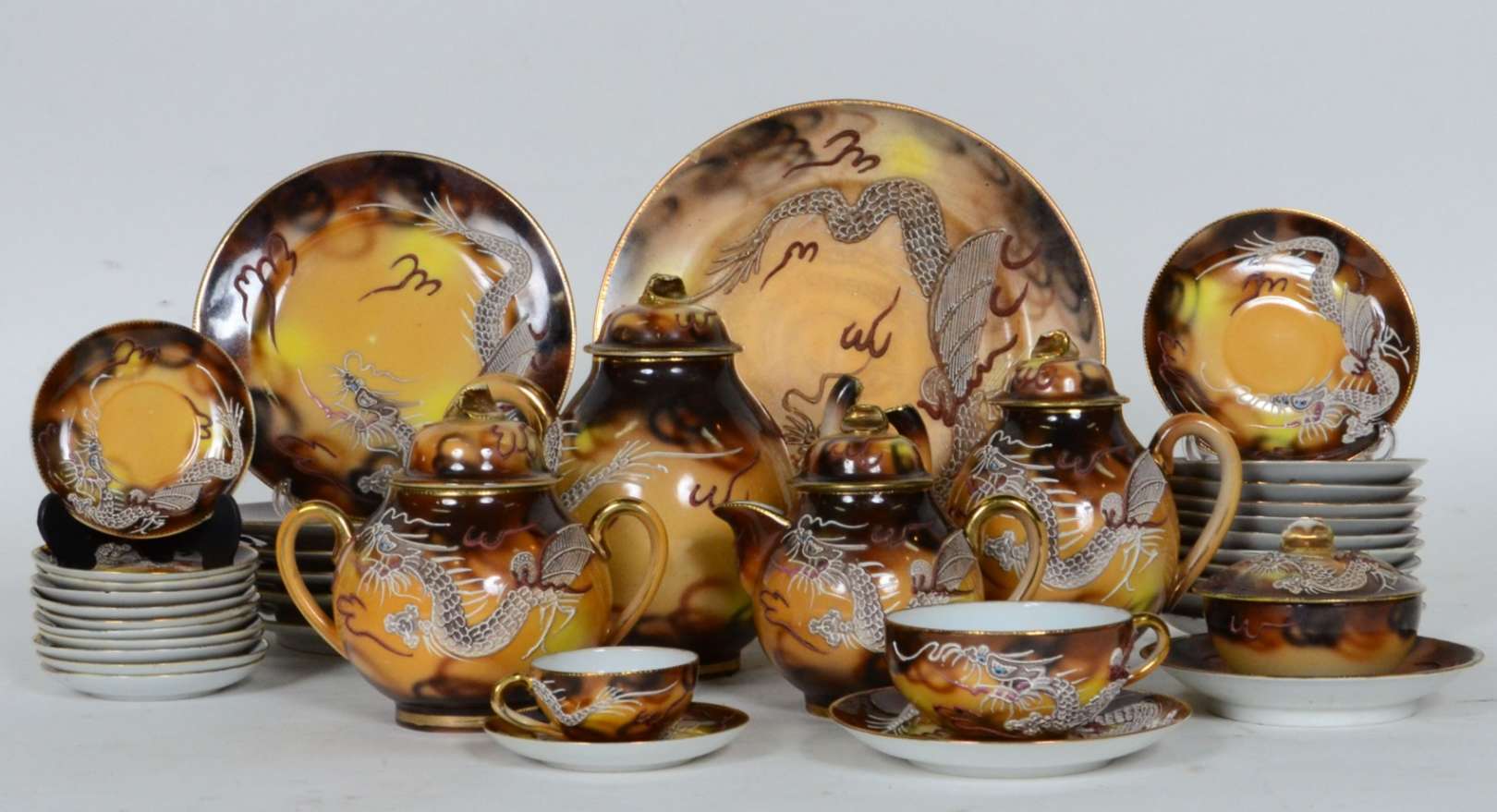 Serviço de chá e café de porcelana oriental decorado com dragão em relevo, composto de 3 bules (1 c/bico quebrado), açucareiro, manteigueira, 12 xícaras de chá com pires, 9 xícaras de café com pires, 6 pratos para sobremesa e 1 prato grande para bolo. Total 33 peças.