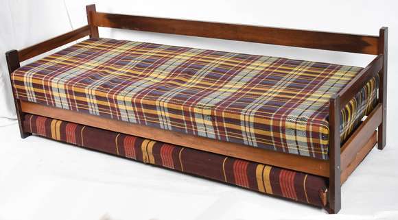 Sofá cama com base de jacarandá e estofamento forrado com tecido xadrez. Fabricação CASA GELLI. Tecido da cama inferi...