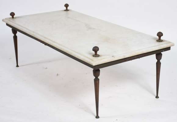 Mesinha lateral de madeira nobre, feitio redondo, tampos de mármore. Três escarradeiras de porcelana(com restauros).