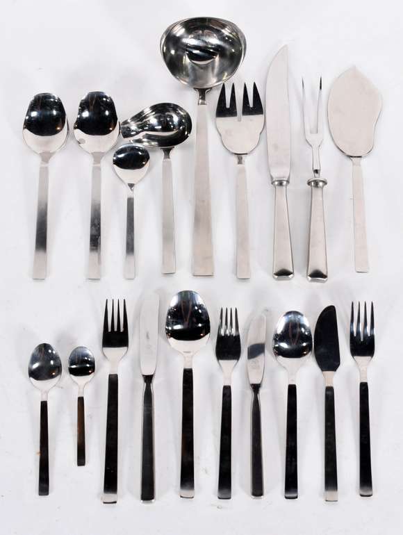 Faqueiro de metal dourado composto de. 12 facas, 12 grafos grandes, 12 garfos pequenos, 12 facas para pasta, 12 colheres grande, 12 colheres para suco, 24 colheres de sopa, 24 colheres e 6 talheres de servir. Total de 126 peças